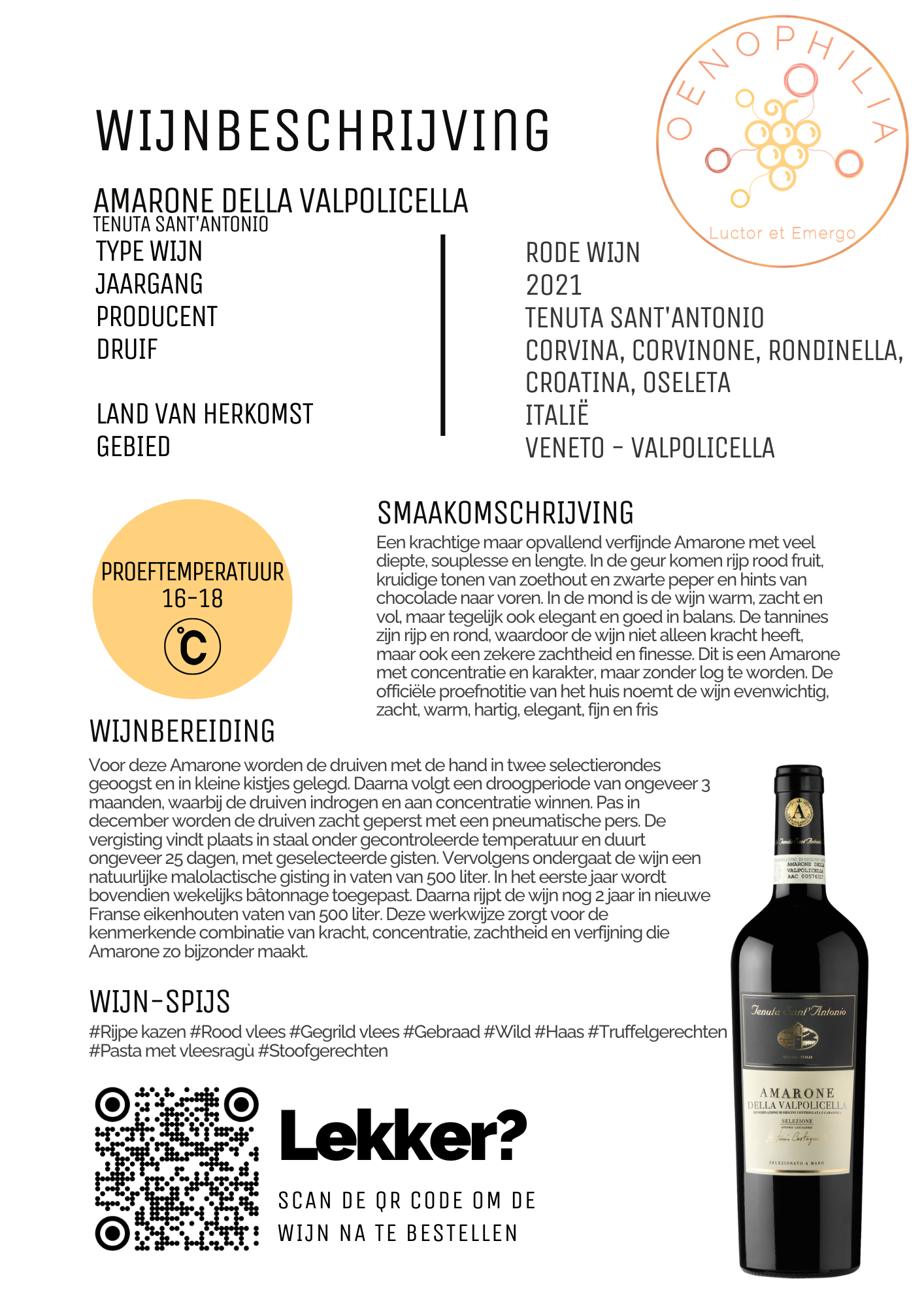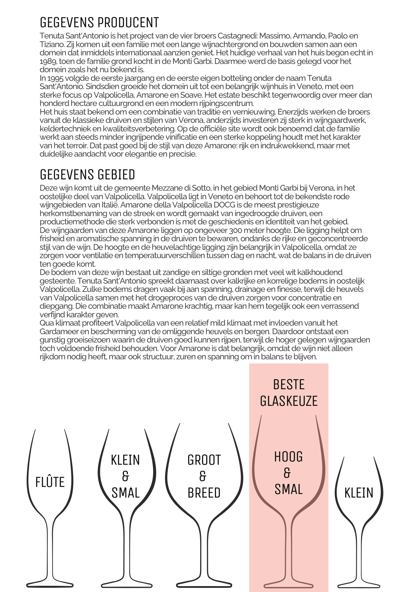 Een krachtige maar opvallend verfijnde Amarone met veel diepte, souplesse en lengte. In de geur komen rijp rood fruit, kruidige tonen van zoethout en zwarte peper en hints van chocolade naar voren. In de mond is de wijn warm, zacht en vol, maar tegelijk ook elegant en goed in balans. De tannines zijn rijp en rond, waardoor de wijn niet alleen kracht heeft, maar ook een zekere zachtheid en finesse. Dit is een Amarone met concentratie en karakter, maar zonder log te worden. De officiële proefnotitie van het huis noemt de wijn evenwichtig, zacht, warm, hartig, elegant, fijn en fris