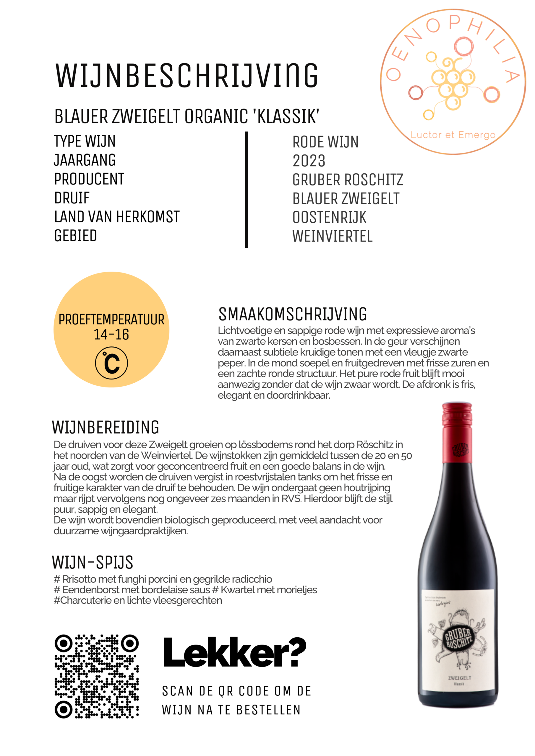 Lichtvoetige en sappige rode wijn met expressieve aroma’s van zwarte kersen en bosbessen. In de geur verschijnen daarnaast subtiele kruidige tonen met een vleugje zwarte peper. In de mond soepel en fruitgedreven met frisse zuren en een zachte ronde structuur. Het pure rode fruit blijft mooi aanwezig zonder dat de wijn zwaar wordt. De afdronk is fris, elegant en doordrinkbaar.