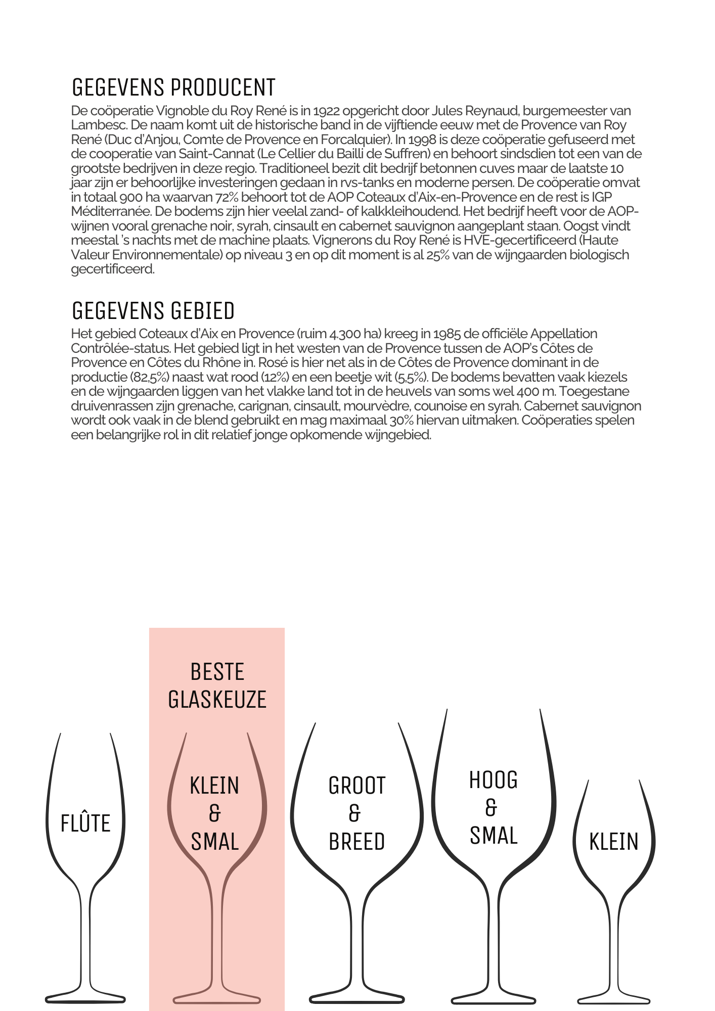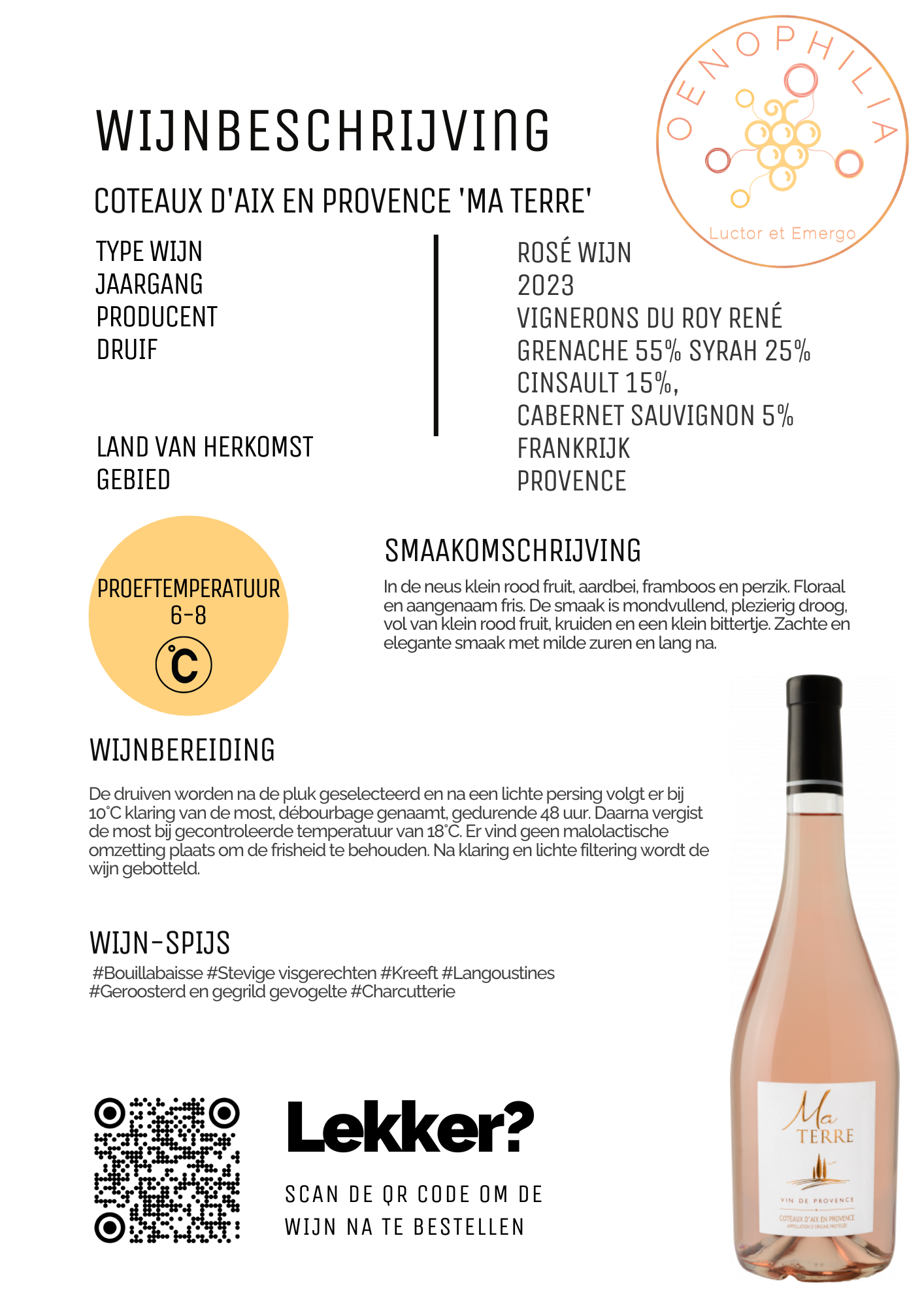 In de neus klein rood fruit, aardbei, framboos en perzik. Floraal en aangenaam fris. De smaak is mondvullend, plezierig droog, vol van klein rood fruit, kruiden en een klein bittertje. Zachte en elegante smaak met milde zuren en lang na.