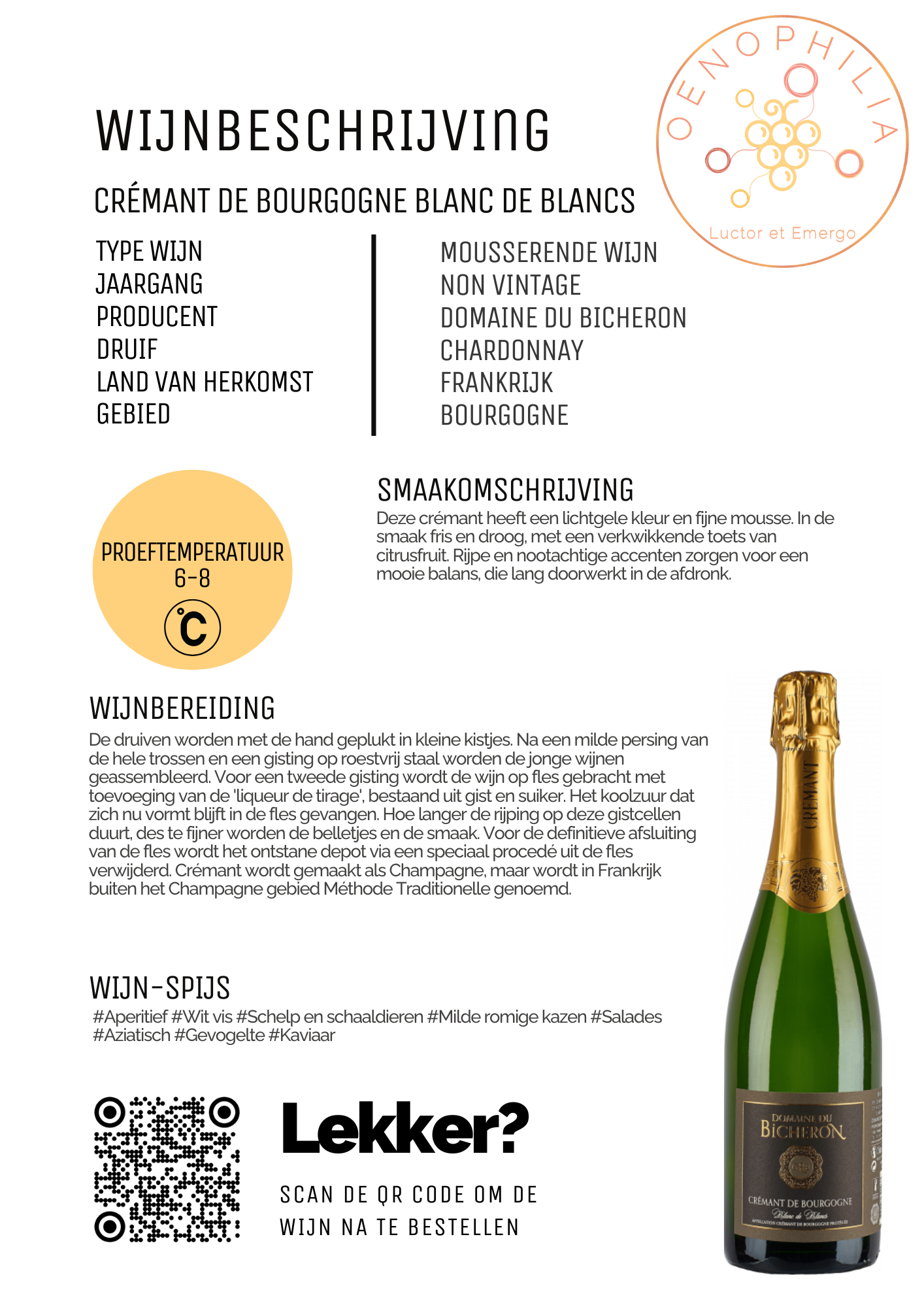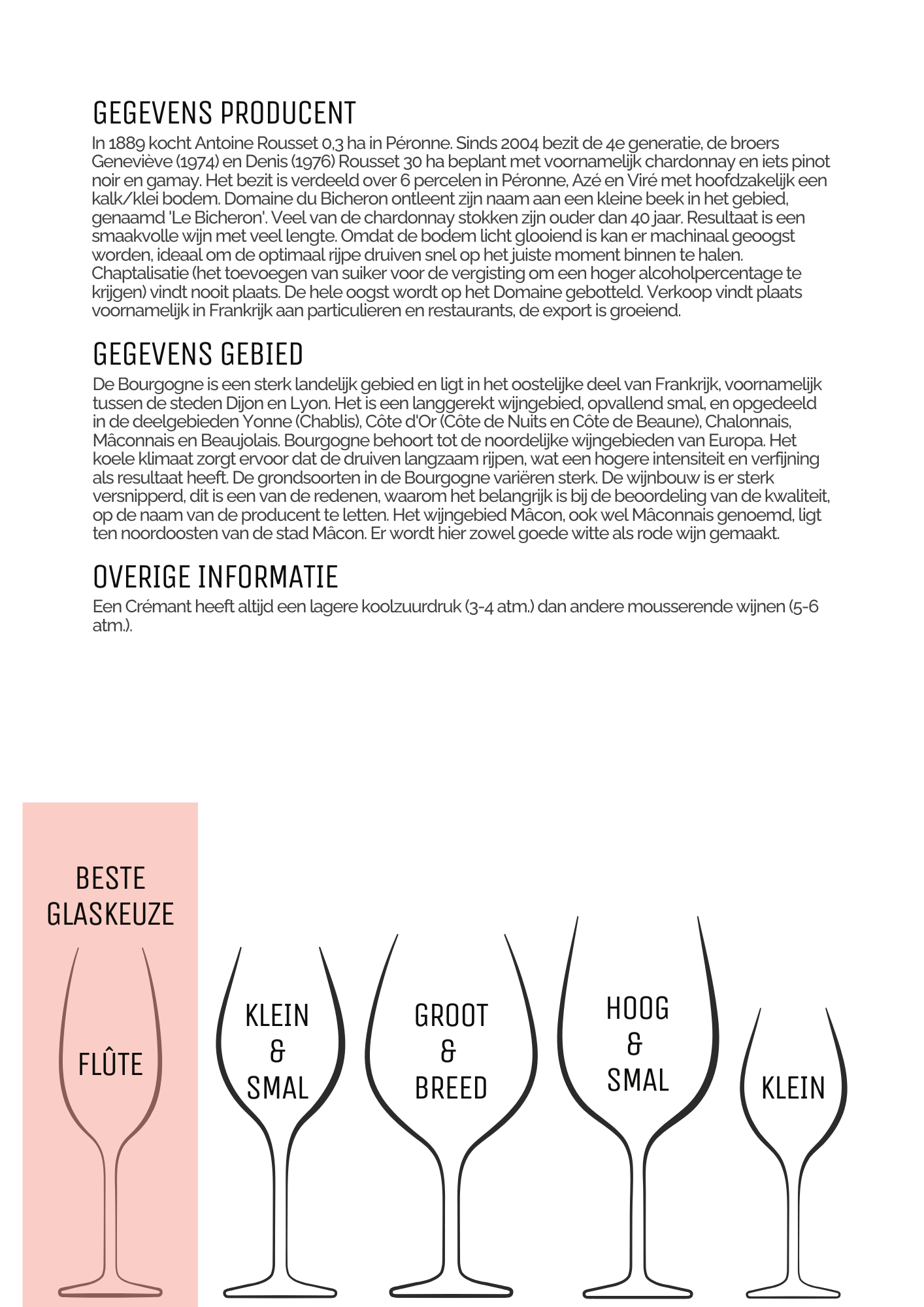 Deze crémant heeft een lichtgele kleur en fijne mousse. In de smaak fris en droog, met een verkwikkende toets van citrusfruit. Rijpe en nootachtige accenten zorgen voor een mooie balans, die lang doorwerkt in de afdronk.