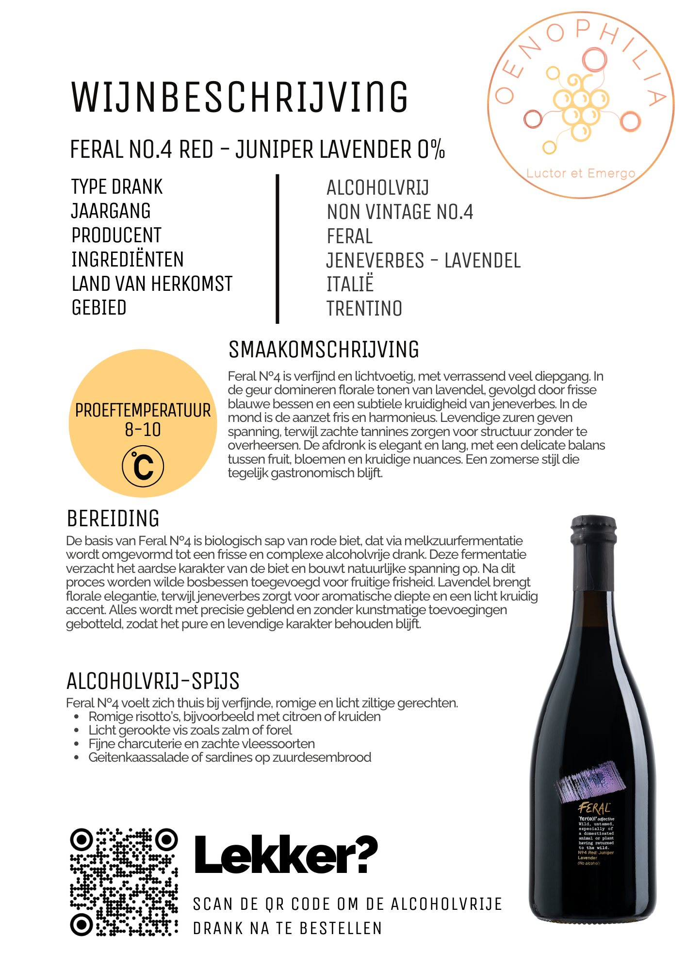 Feral komt uit de Dolomieten in Trentino Alto Adige en maakt serieuze alcoholvrije fermentaties. No.4 Red start met gefermenteerd bietensap. Melkzuurfermentatie zet suikers om in frisse zuren en bouwt structuur op zonder alcohol. Daarna volgen infusies met jeneverbes en lavendel, die het glas een kruidige ruggengraat en een zachte florale zweem geven.