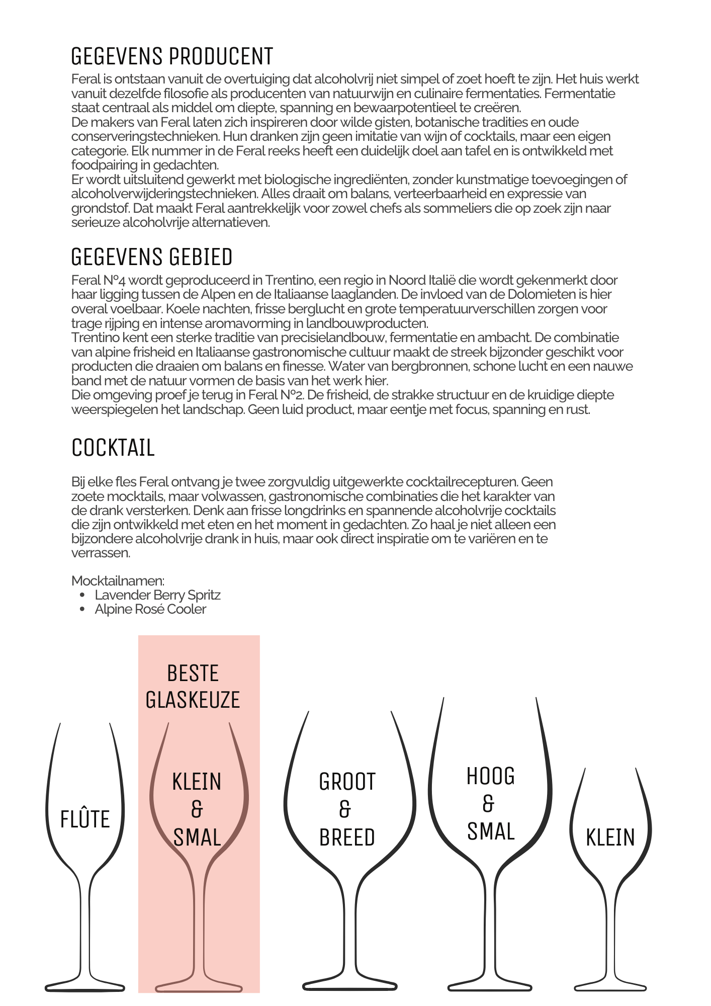 Tegelijkertijd biedt Feral volop ruimte om te variëren. De dranken vormen een sterke basis voor mocktails met karakter. Geen zoete mixdrankjes, maar volwassen, gastronomische combinaties die passen bij een borrel of diner. Bij elke fles ontvang je twee zorgvuldig uitgewerkte mocktailrecepturen. Geen suggesties, maar duidelijke recepten met ingrediënten en stappen, zodat je thuis direct aan de slag kunt.