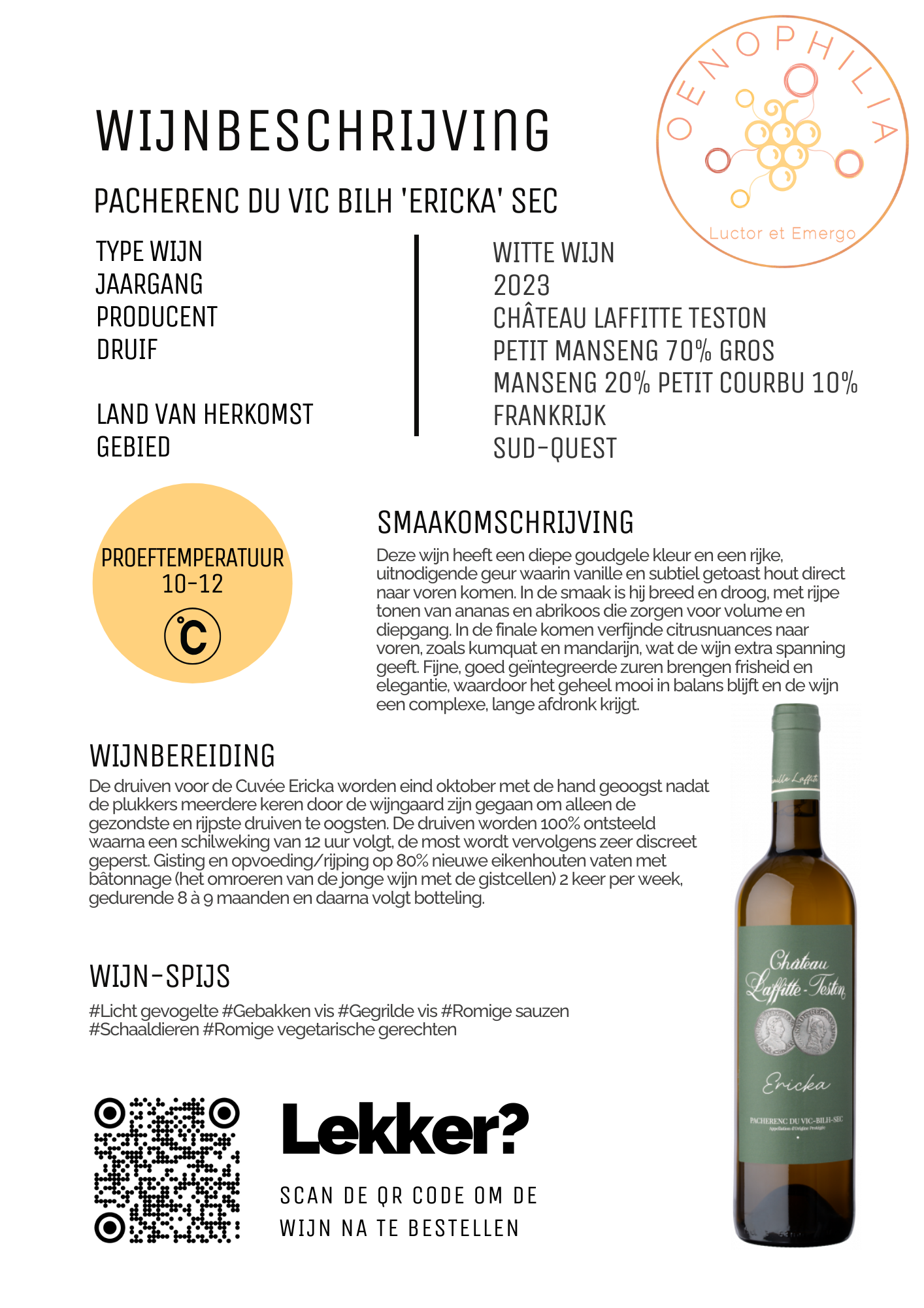 Deze wijn heeft een diepe goudgele kleur en een rijke, uitnodigende geur waarin vanille en subtiel getoast hout direct naar voren komen. In de smaak is hij breed en droog, met rijpe tonen van ananas en abrikoos die zorgen voor volume en diepgang. In de finale komen verfijnde citrusnuances naar voren, zoals kumquat en mandarijn, wat de wijn extra spanning geeft. Fijne, goed geïntegreerde zuren brengen frisheid en elegantie, waardoor het geheel mooi in balans blijft en de wijn een complexe, lange afdronk krijgt.