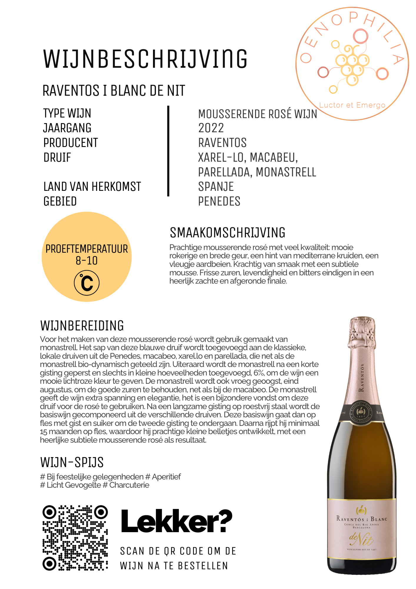 Prachtige mousserende rosé met veel kwaliteit: mooie rokerige en brede geur, een hint van mediterrane kruiden, een vleugje aardbeien. Krachtig van smaak met een subtiele mousse. Frisse zuren, levendigheid en bitters eindigen in een heerlijk zachte en afgeronde finale.