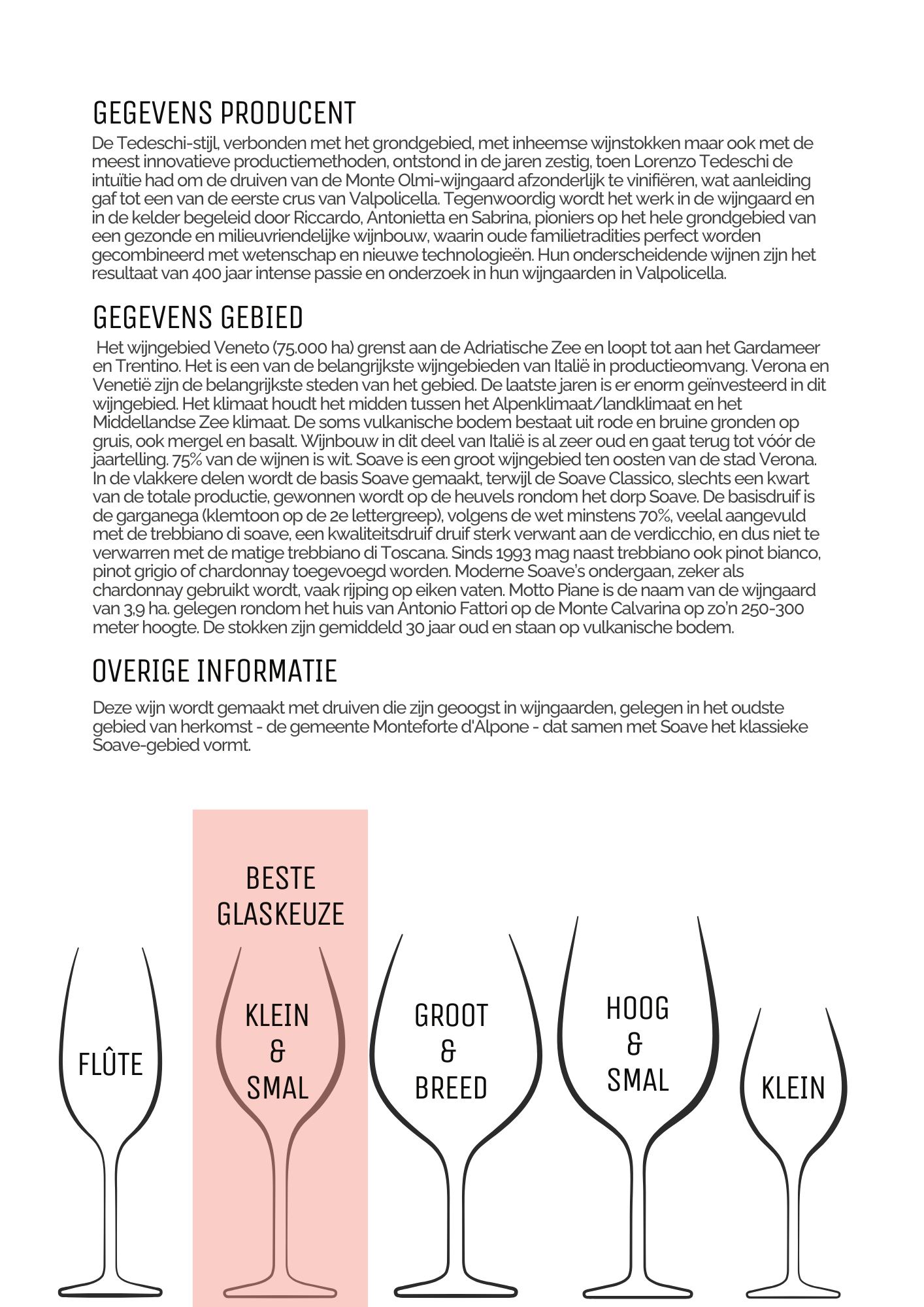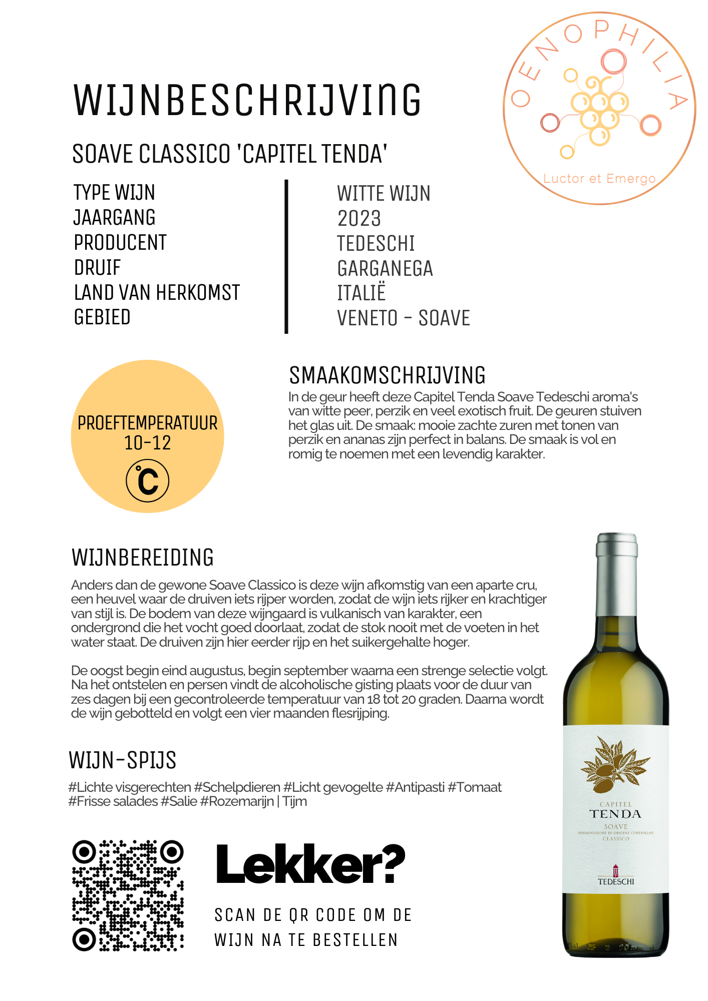 In de geur heeft deze Soave aroma’s van witte peer, perzik en veel exotisch fruit. De geuren stuiven het glas uit. De smaak: mooie zachte zuren met tonen van perzik en ananas zijn perfect in balans. De smaak is vol en romig te noemen met een levendig karakter.